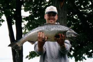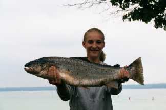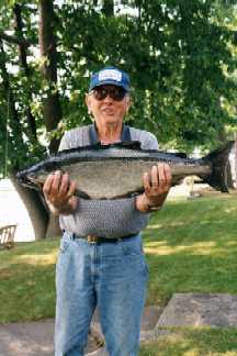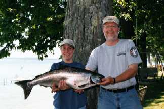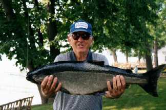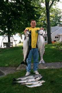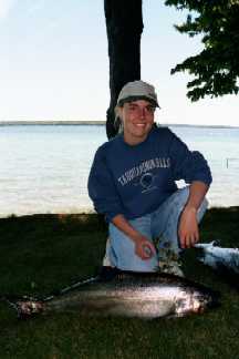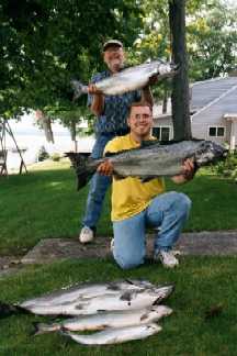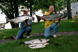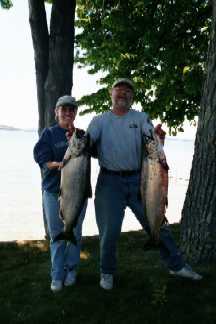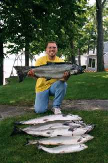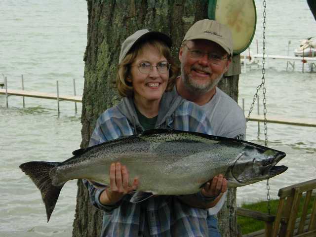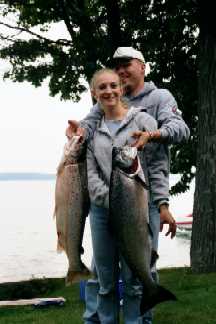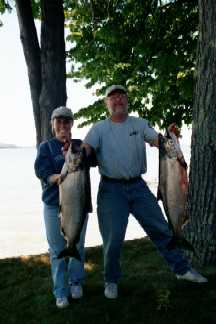 This page represents the fishing hall of fame. The first entry is Susan (with Steve, who acts as fishing guide). Susan caught this salmon in Lake Huron the weekend of June 23, 2001. Some of the fish you see below may be duplicated in more than one picture. That is not meant to confuse you, I just couldn't tell them apart.