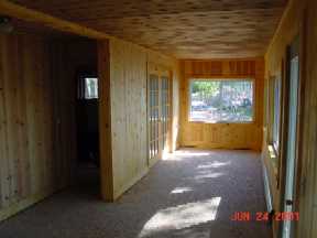 The finished game room, after taking out a wall, framing in the screened-in porch, and adding French doors.